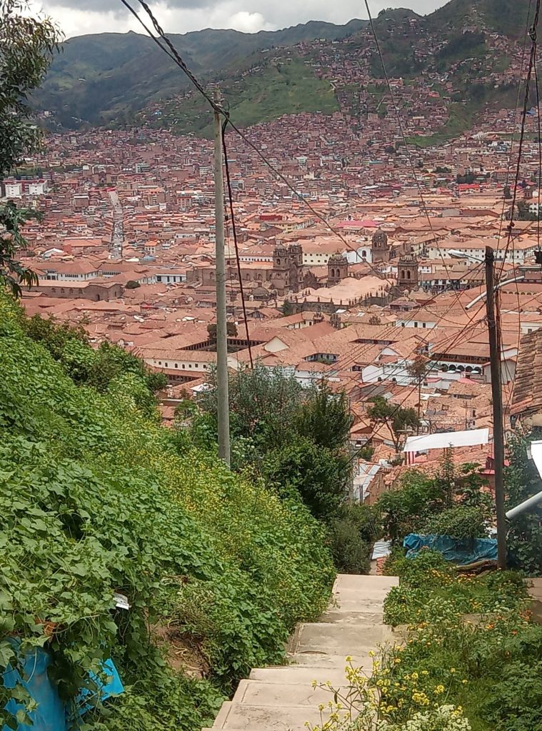 Der Mittelpunkt der Welt für die Inka, bevor die Spanier hier alles kurz und klein geschlagen haben. Vom Dschungel in die Anden. Von tropischen Klima ins Gebirge. Es regnet hier, 16 Grad. Vor ein paar Tagen hatte ich noch 34 Grad. Das ist schon hart. Ich merke es, dass auf 3300 Metern die Spaziergänge anstrengend sind, Koka Blätter helfen das etwas, aber nicht viel. Ich keuche wie eine englische Eisenbahn im 19. Jahrhundert.