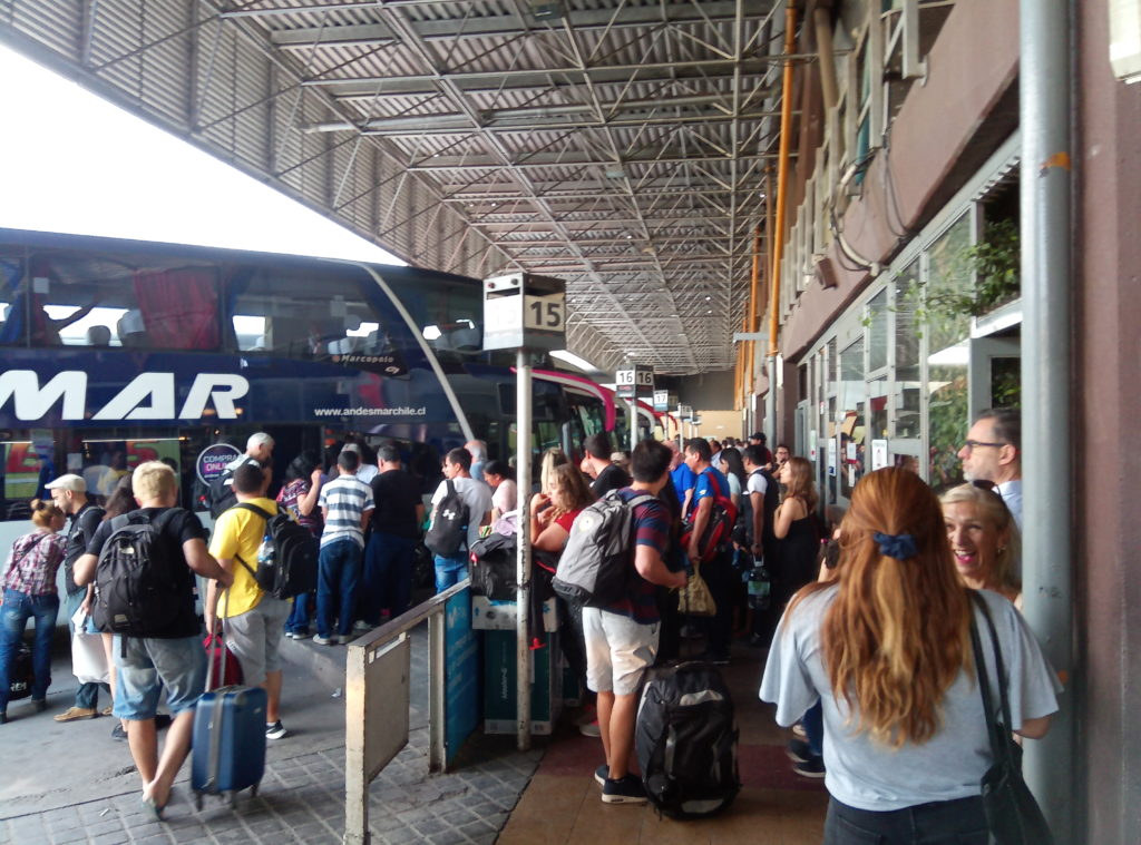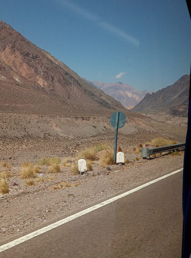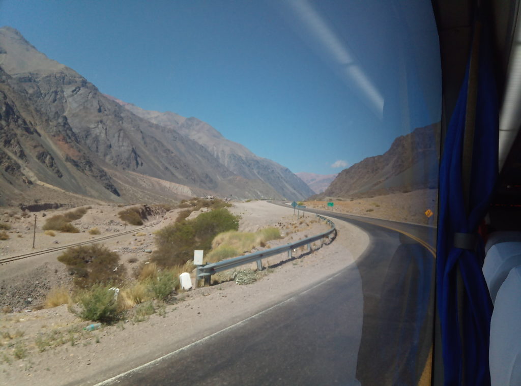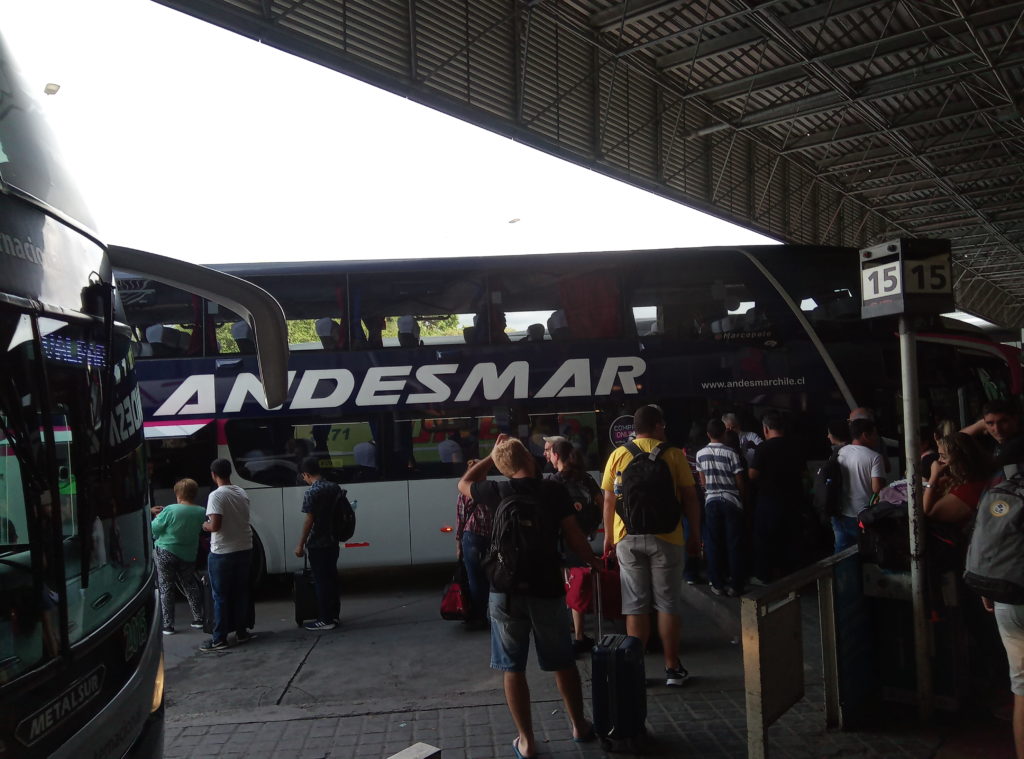 Heute morgen war es dann soweit Argentinien und Mendoza zu verlassen. Ich kann Argentinien sehr empfehlen, hat mir sehr gut gefallen. Fröhliche, offene und herzliche Leute, gutes Essen, hervorragender Wein und beeindruckende Landschaften. Elio, der Vermieter des Apartement, ein netter Typ, in etwa meines Alters, der mir viele gute Tips für Mendoza gegeben hat und der insgesamt drei Jobs hat, um über die Runden zu kommen, hat mich freundlicherweise zum Busbahnhof gefahren. Natürlich zu früh, gegen 8 Uhr, Abfahrt war erst gegen 9 Uhr. Die Busse haben Abfahrtsgleise, dort gibt man direkt am Bus sein Gepäck ab und bekommt dafür einen Bon, mit Nummer. Die Busses sind sehr komfortabel, insbesondere in der Cama/Full Bed Klasse, die Semi Cama/Half Bed Klasse entspricht in etwa dem, was man von Flixbus und Co. kennt.