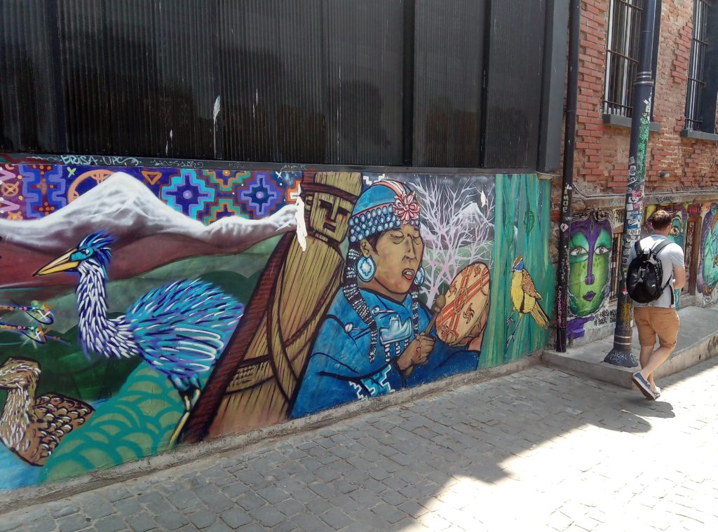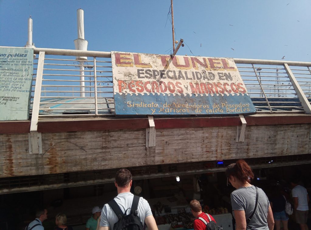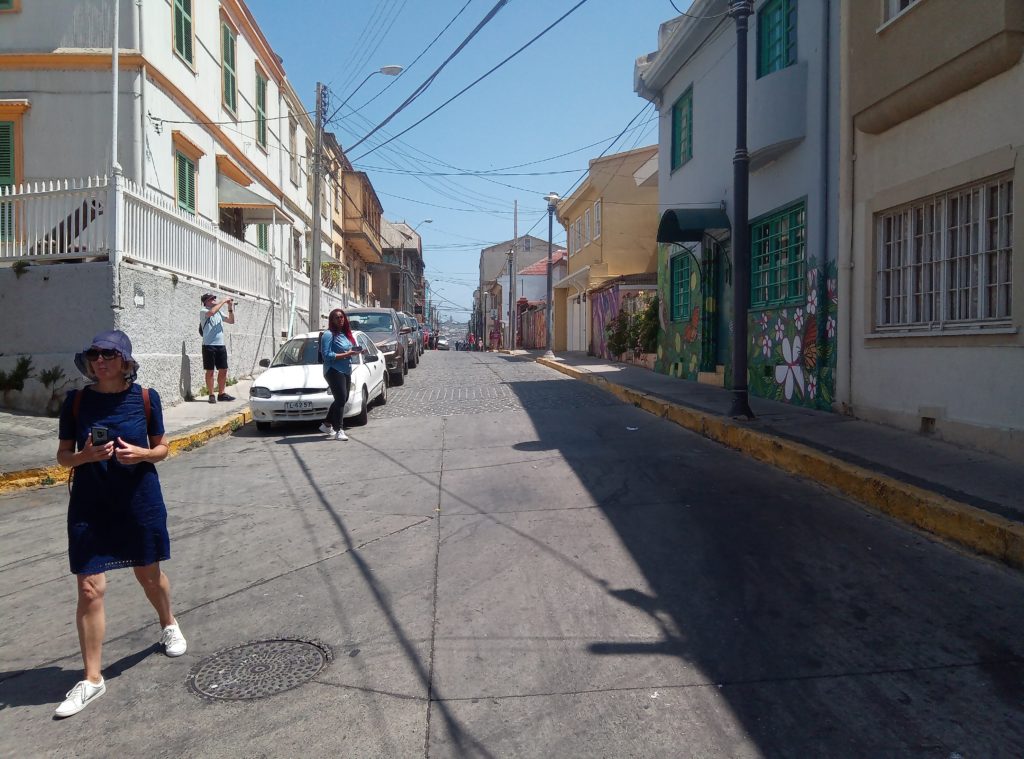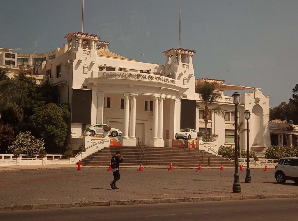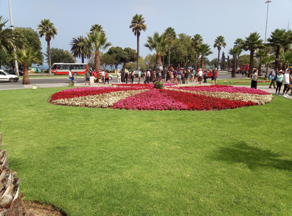 Mein erstes Lama. Ein echtes Lama, es gibt auch Partner/Unterarten.Schwach duftende Blüten auf dem weg nach ValparaisoKurzer Zwischenstop für einen Snack. So kleine Andachststätten gibt es hier überall an den Straßen und HäusernVina del Mar. Die Touristenhochburg in Chile für EinheimischeEin paar schöne alte Häuser gibt es hier. Die Stadt ist noch relativ jung. Sie wurde gegen 1910 von einer reichen Familie aus Spanien gegründet, die im Weinbusiness tätig ist. Daher auch der Name Vina del Mar.Geklaut von den Osterinseln, der ist bestimmt verdammt einsam hier auf dem Festland.Eine Gartenskulptur aus Pflanzen,Unser Tourguide Michelle in vollem Einsatz, mit dabei überwiegend Amerikaner, eine Chinesin, ein Inder und El AlemanPrähistorischer Wasserspeicher.Die Blumenuhr, die jeder mindestens einmal fotografiert haben muss, damit bewiesen ist, dass man in Vina del Mar war.Touristengimmick. Filmfiguren, die für ein Foto rund um Blumenuhr herumlungern. Ich möchte nicht wissen, wie heiß es in diesen Kostümen ist. Mir läuft bei 35 Grad auch so schon das Wasser herunter.Fischmarkt in Valpariso. Möwen, Möwen und noch mehr Möwen.Der Fang ist jetzt wirklich frisch.Meine beiden Kumpels von der Food and Markets Tour von gestern sind auch wieder dabei. Klein ist die Welt.Strandleben auf chilenisch.Ausrüstung für den Leinenfang. Ranjid, geh gefälligst aus dem Bild!Der Schutzpatron der Fischer.Leider nicht so gut zu erkennen, Aber das unter der Brücke sind Seelöwen.Das war richtig beeindruckend, die Grafitti, die es in den kleinen Gassen von Valparaiso zu sehen gibt ist wirklich gut und schön.Mein Liebling Polar, die Kunstwerke sind alle signiert.Valparaiso ist auch ein beliebter Ausflugsort für Kreuzfahrtschiffe.Das sind Darstellungen die die Historie eines chilenischen Eingeborenstamms dokumentieren. Die etwas wir Zirkus anmutenden Köpfe sind aus Walknochen hergestellt worden. Die Bemalung ist auch von dort.Nur Museum – altes Cable Car GetriebeAuch lustig, die JungsBlick über ValparaisoIn betrieb befindliche Cable Car Maschine. Dauert nicht lange. 5 Minuten und man ist unten oder oben. Und nur 100 chilenische Peso teuer.Ah, endlich Essen, Seafood, sehr lecker aber auch teuer.Mein dritter Vorname ist ab jetzt Nachtisch.2 Jungs aus Washinghton DC, ein Paar aus North-Carolina und Ranjid, der in Blockchain macht und mal einen Tag Pause braucht.Dann noch einmal eine Bodega. Die Weinprobe war verglichen mit Argentinien eher lieblos. Und ich muss sagen, mir schmeckt der argentinische Wein auch besser.Das Ambiente war aber schön.Unser kleine Faschingstruppe.Und zurück in Santiago de Chile noch ein bisschen herumlaufen.Das war irgendwie so eine Art Comdey. Mein Spanisch ist leider nicht ausreichend gewesen, um die Witze zu verstehen. Mitten auf dem zentralen Platz, Samstag gegen 21 Uhr.Zeit fürs Bett.