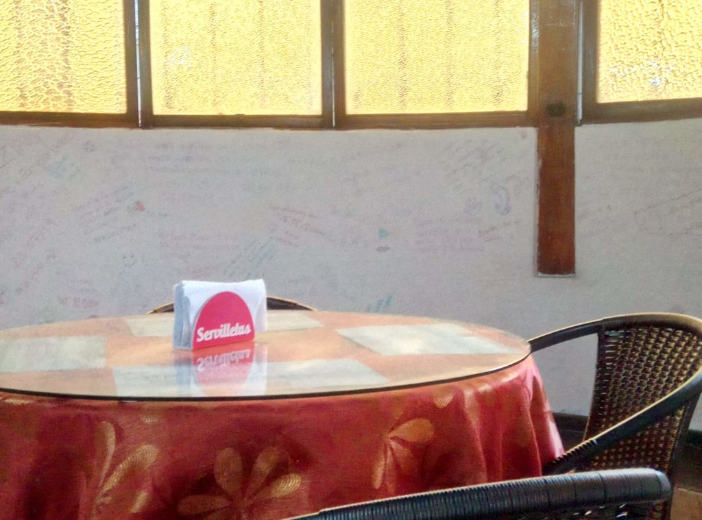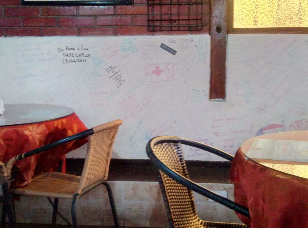 „Geldwäsche“ – die Scheine sind versehentlich mit in die Waschmaschine gekommen, mal sehen, ob sie noch brauchbar sind wenn sie trocken sind.An den Wänden haben sich die Gäste verewigt, von Südafrika bis Kanada, hier war schon die ganze Welt, jetzt auch ich.Saulecker, Empanadas mit ShrimpsfüllungMeine ersten CevicheEiner ist noch da.Terminato
