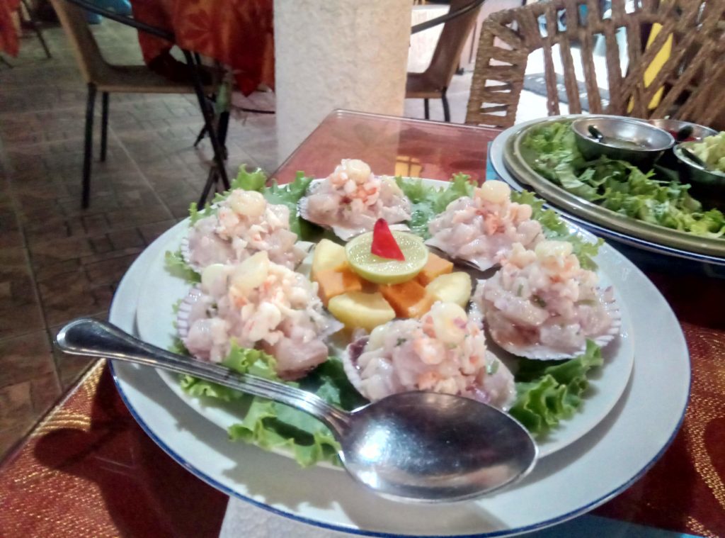 Hier kann man es durchaus aushalten, auch wenn das Wetter ein wenig an Dampfbad erinnert, heiß und feucht. Da fällt es nachts schon schwer zu schlafen. Heute habe ich zum ersten Mal Ceviche gegessen. Das peruanische Nationalgericht, roher Fisch mit Limettensaft, Seeeeehhhhr lecker und leckere Fischempanadas.