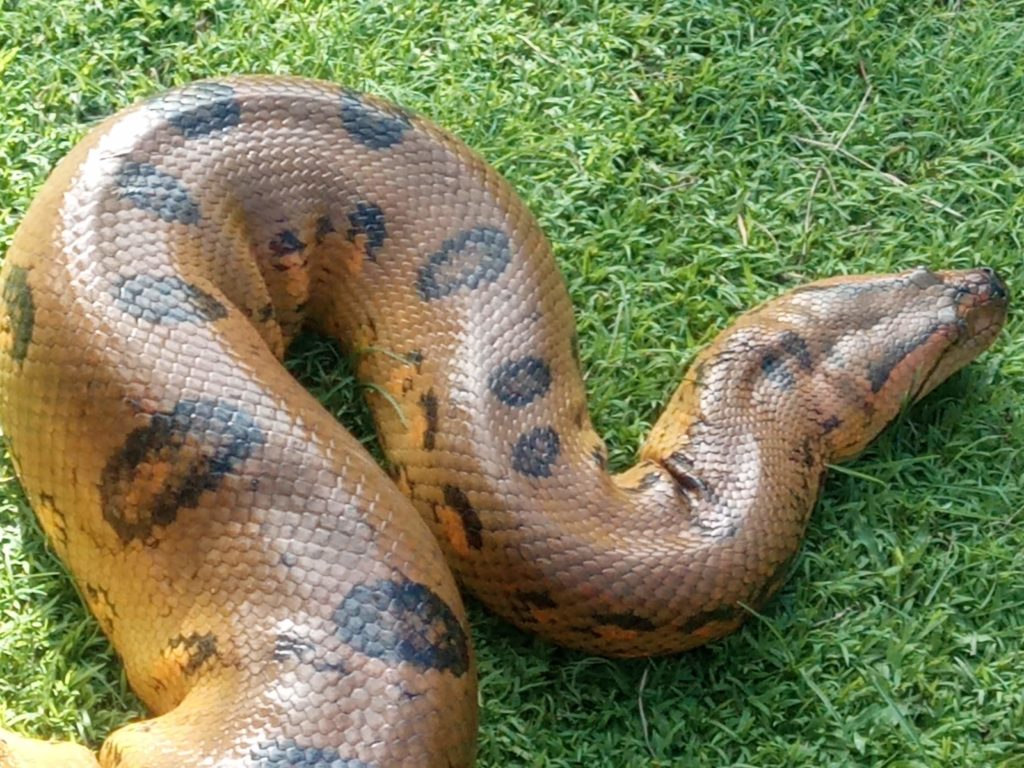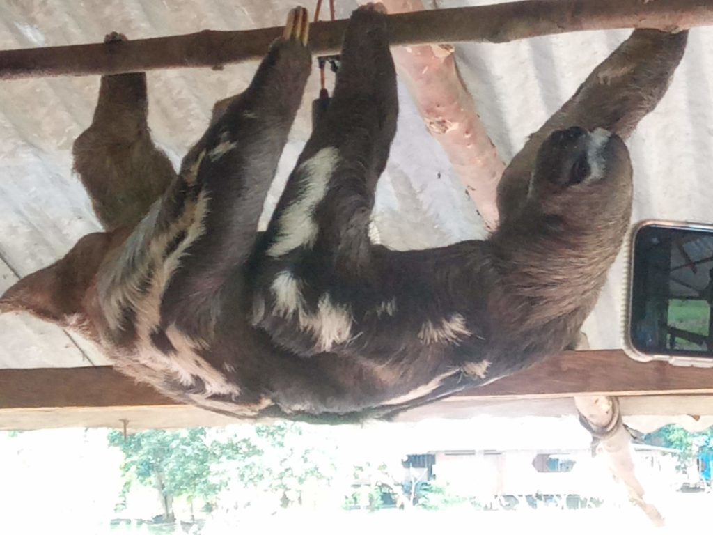 Damit wir für das Fotoalbum wenigstens ein paar Tiere bekommen, wurden wir dann in das ca. 3 Minuten entfernt gelegene kleine Dorf geleitet. Ca. 250 Einwohner, sehr auf Touristen ausgelegt, über Schilder, Souvenirs BlaBla. Dort konnten wir dann drei als Hausbesetzer wohnende Faultiere fotografieren und Souveniers kaufen. Danach durften wir eine Anaconde gegen Entgelt fotografiern und Souveniers kaufen. Danach in einen Dorfladen gegen, hochprozentiges Urwaldviagra und….. Souveniers kaufen.